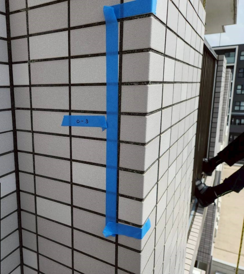 外壁タイルは経年劣化により落下をする可能性が非常に高いため、タイルを1枚1枚、丁寧に調査を行い、危険な箇所を特定しました。この調査結果を図面に表記してお客様にご提出をします。また今回の調査結果を受けて修繕工事のお見積りもさせて頂く運びとなりました。事前にロープアクセスによる調査をすることで工事中に追加見積りが発生しない明朗な見積書の御提案が出来るため、修繕工事の予算取りもスムーズに行うことが出来るのが最大のメリットになります。